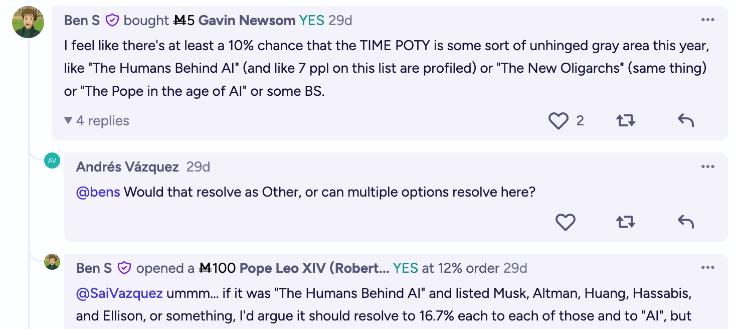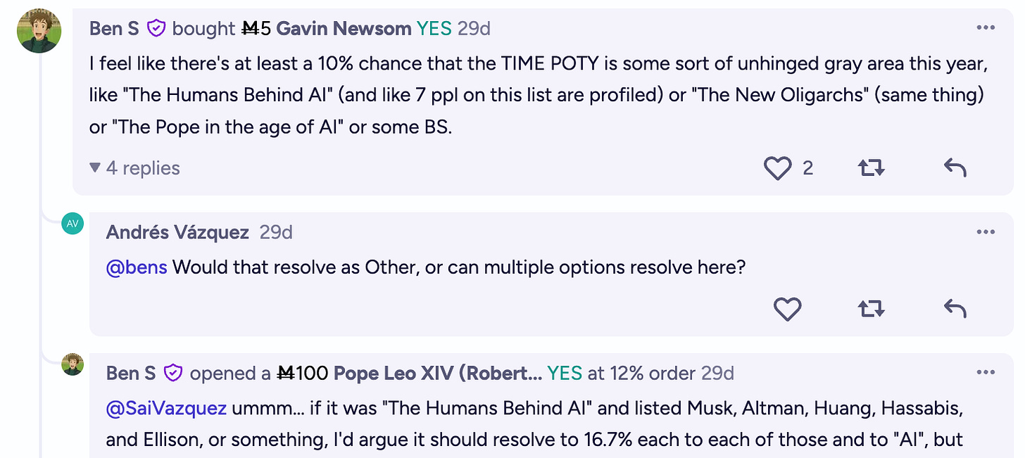 Manifold can resolve to partial probabilities, but this introduces its own complexities. What if TIME were to announce… idk… a broad category that is inclusive of several people on the list? What if it’s several people or concepts, some of whom are listed among the options, but some of whom are not? The Manifold market tries to account for these particular possibilities, but there’s always been a chance that TIME would muddle the award in some unpredictable way.