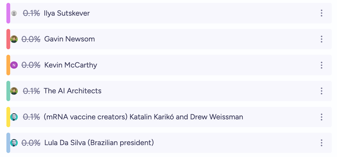 P.S. As I went back through the 2023 TIME Person of the Year market, I noticed that among the 80 options, two of them were my submissions: “Gavin Newsom” and…. “The AI Architects.” Ah, well, nevertheless.