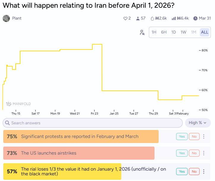 We’re seeing: the complete crash of the rial, bazaaris joining, regional proxies decimated, Khamenei’s age creating succession uncertainty, Trump’s demonstrated willingness to bomb (along with all the uncertainty his presence creates anyway), and protests that started economic but became anti-regime.