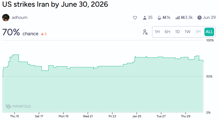 Odds for US strikes targeting areas in Iran by February hover around 40%, and 60-70% for until the end of June.